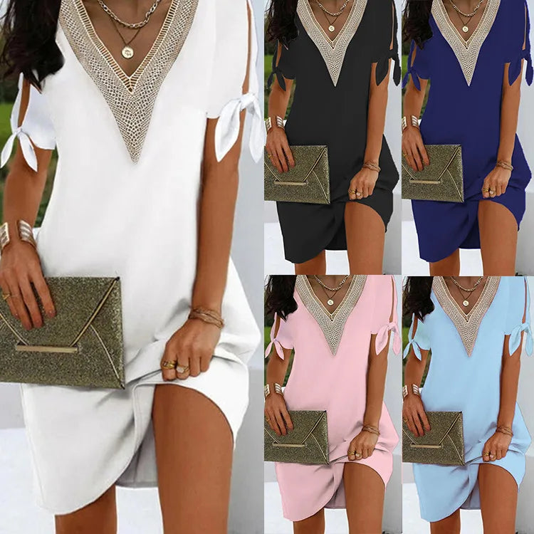 Fashion V-neck Short Sleeve White Lace Mini Dress Women 2023 Summer Casual Bow Loose Elegant Off Shoulder Dresses For Women